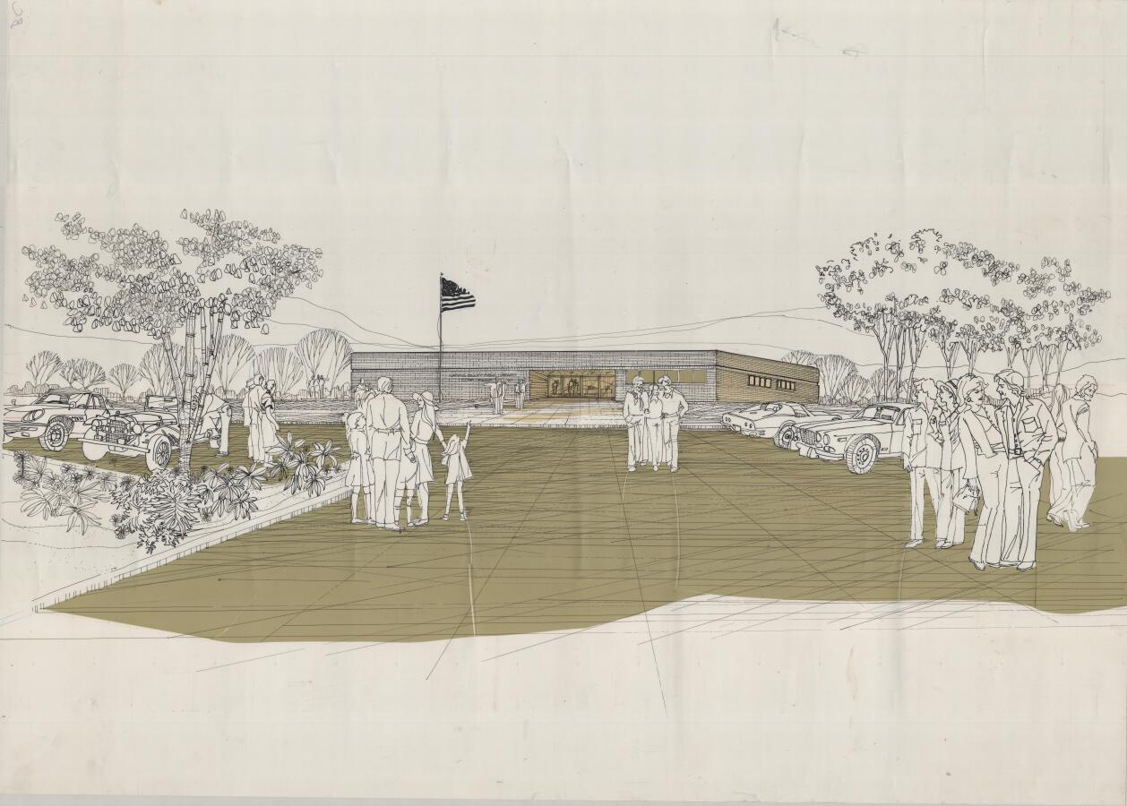 Two artistic renderings from the 1970s of the building designed by Haywood Jordan and McCowan, Inc. can be found in Volume 5 of the Freeman Memorial Library Scrapbook (covering 1971-1975). This was the branch's second building, a multi-use space for several county departments. The library moved out of this building in 2004 into a new building across the parking lot.