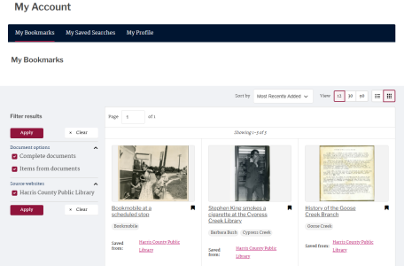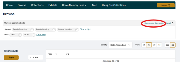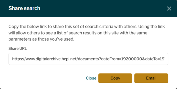 Similarly, My Account also provides a 'Share Search' function. At the top of the search results list, to the right of the search criteria box, a 'Share Search button' will be visible. Clicking that button opens a Share Search pop-up that provides a unique URL for that search list to enable collaborative work or research. For example, librarians could share a search with researchers, students could share a search with peers, or teachers may find it helpful to share list results with students when setting an essay on a set selection of materials.